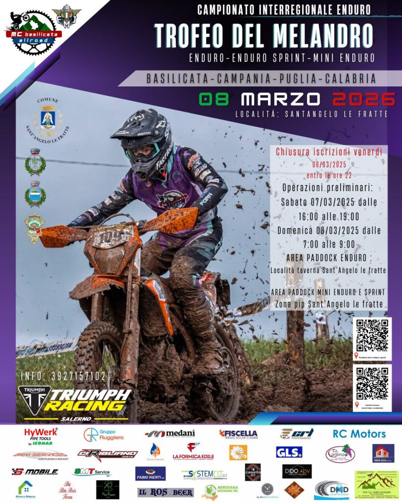 E’ tutto pronto a Sant’Angelo Le Fratte (PZ) per il secondo appuntamento con il Campionato Interregionale di Enduro FMI valido per la Campania e la Basilicata, alle quali si uniranno per questa occasione anche i piloti di Puglia e Calabria. In più alle categorie di Enduro saranno ammessi anche i piloti di Minienduro, Sprint e della classe Bicilindriche. Organizza il motoclub Basilicata ALLROAD che ha denominato la giornata di gara Trofeo del Melandro il fiume che attraversa le province di Potenza e Salerno, a dimostrazione della ormai storica e consolidata sinergia con la quale i due comitati regionali collaborano da diversi anni in questa disciplina. Il risultato sarà una gara che prevede circa 200 piloti e che si preannuncia spettacolare, come ci ha anticipato il patron di casa Nicola Positino. Saranno ben 3 le prove speciali realizzate, una cross test e una enduro test per i piloti di enduro, più un fettucciato dedicato ai Minienduro, Sprint e Bicilindrici. Previsto anche un trasferimento interamente in fuoristrada caratterizzato da un fondo con diverse condizioni per stimolare le capacità di chi parteciperà. Presente anche STAR BIKERS che raccoglierà cronache e commenti della gara. A seguire anche le coordinate per raggiungere il paddock e le prove speciali.