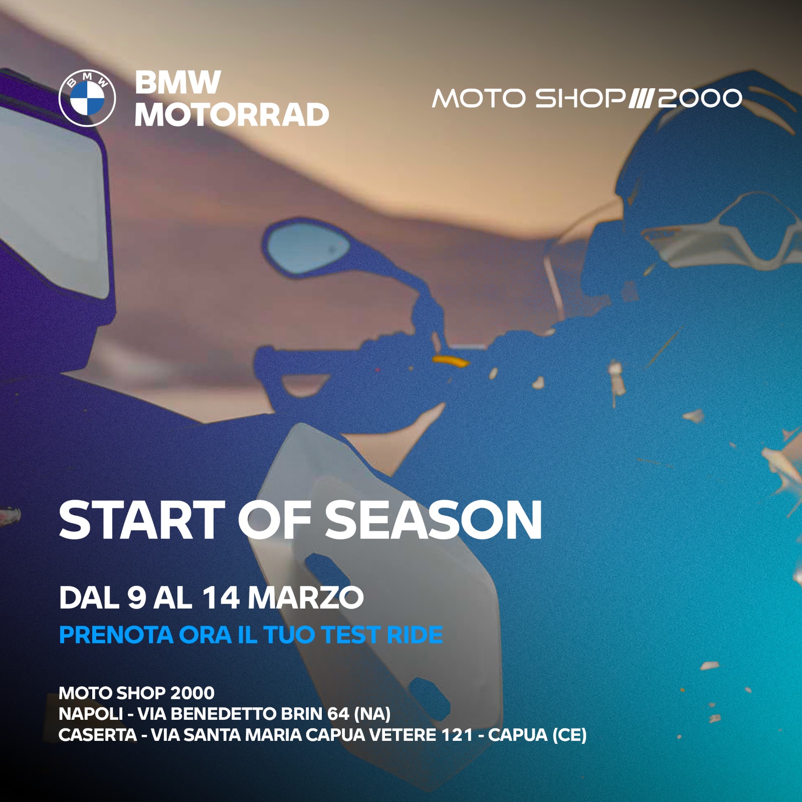 Anche per BMW Motorrad e quindi MOTOSHOP2000 questa è una delle settimana più importanti della stagione. Inizia di fatto una nuova avventura e gli store di Napoli e Capua (CE) sono pronti per accogliere i tanti appassionati a bordo della gamma 2026. Si potrà prenotare a questo LINK la prova in strada con la BMW Motorrad dei sogni. Approfittate di questa occasione e non dite che non vi avevamo avvisati! Ci vediamo in strada.