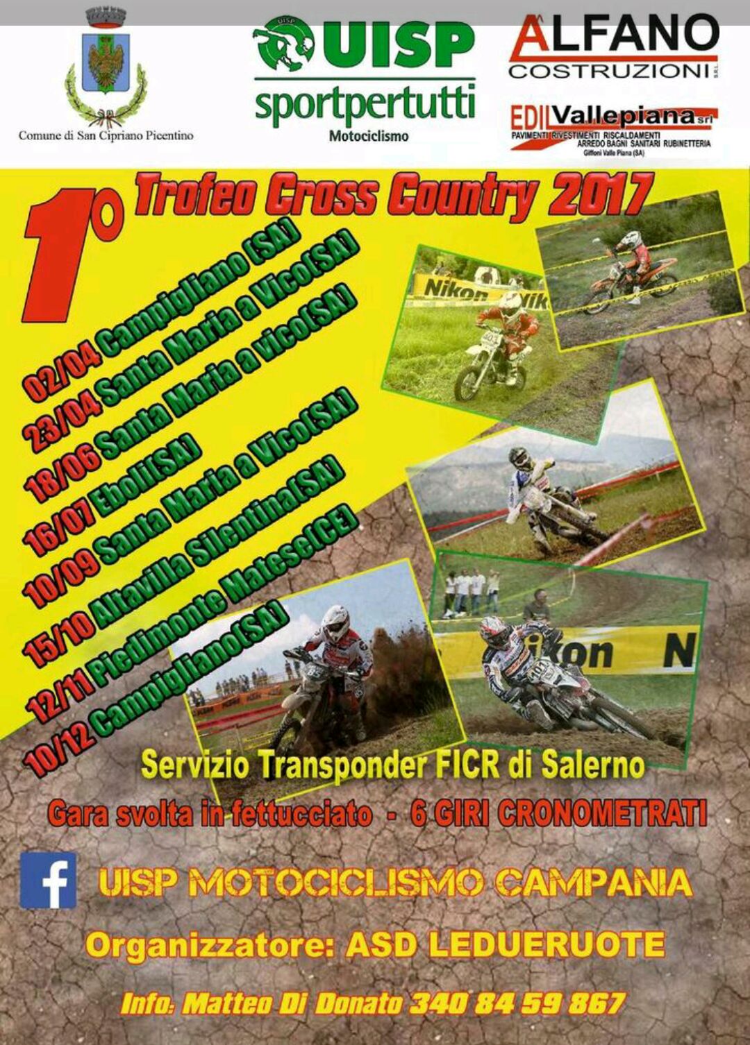 La UISP Campania comunica il calendario del Trofeo Cross Country 2017 che si svilupperà su 8 gare alle quali se ne potrebbero aggiungere altre 2 in corsa per la stagione. Il Cross Country è una specialità nuova ed avvincente, si svolge in un unica prova speciale, che potrebbe comprendere anche ostacoli naturali o artificiali, per rendere la gara più affascinante anche per il pubblico. Si inizierà il 2 aprile a Campigliano (SA) che chiuderà la stagione il 10 dicembre passando per le tre prove di Santa Maria a Vico (SA) in diverse località, poi ci saranno le gare di Eboli, Altavilla Silentina (SA) e Piedimonte Matese (CE). Anche le zone di Roccarainola (NA) e Monteforte Irpino (AV) potrebbero essere coinvolte in due giornate diverse visto l’interessamento dello staff di Moto Ok che ha dato disponibilità per organizzare. Nel frattempo sono già partite le adesioni di diversi piloti che hanno già effettuato la licenza sportiva UISP, che richiede il certificato medico sportivo. Una serie di convenzioni sono già disponibili per info basterà contattare il numero 340 845 9867